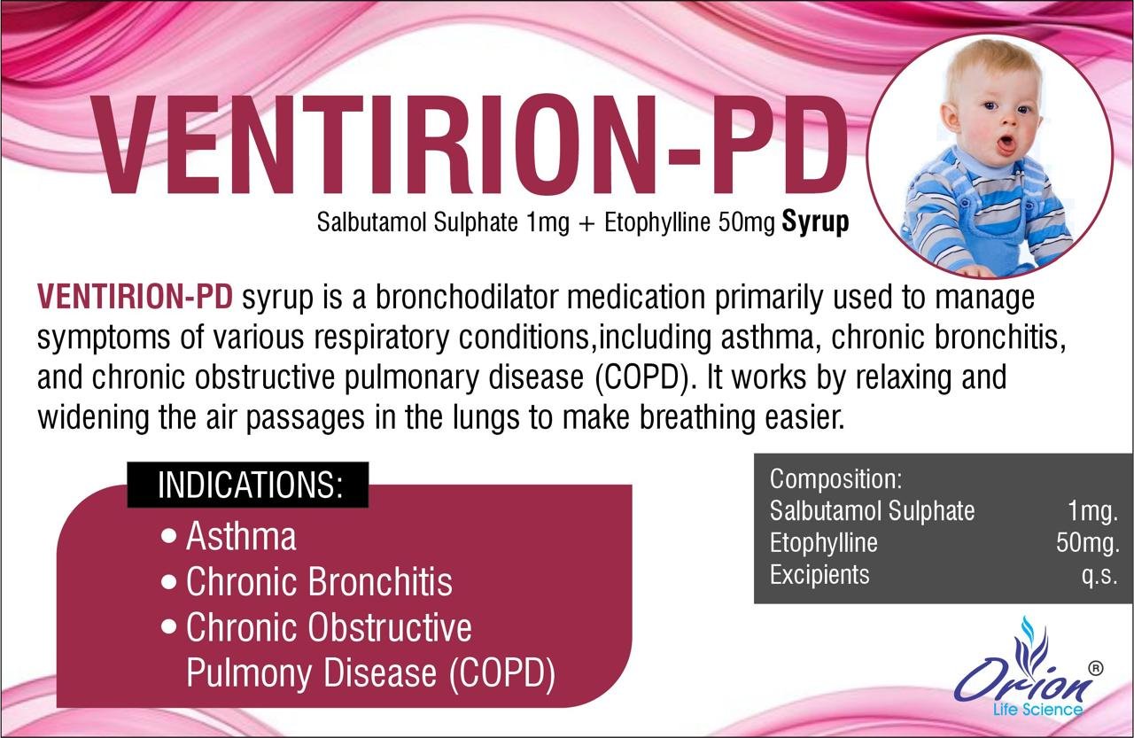 VENTIRION-PD SYRUP IS A BRONCHODILATOR MEDICATION PRIMARILY USED TO MANAGE SYMPTOMS OF VARIOUS RESPIRATORY CONDITIONS, INCLUDING ASTHMA, CHRONIC BRONCHITIS, AND CHRONIC OBSTRUCTIVE PULMONARY DISEASE (COPD). IT WORKS BY RELAXING AND WIDENING THE AIR PASSAGES IN THE LUNGS TO MAKE BREATHING EASIER.